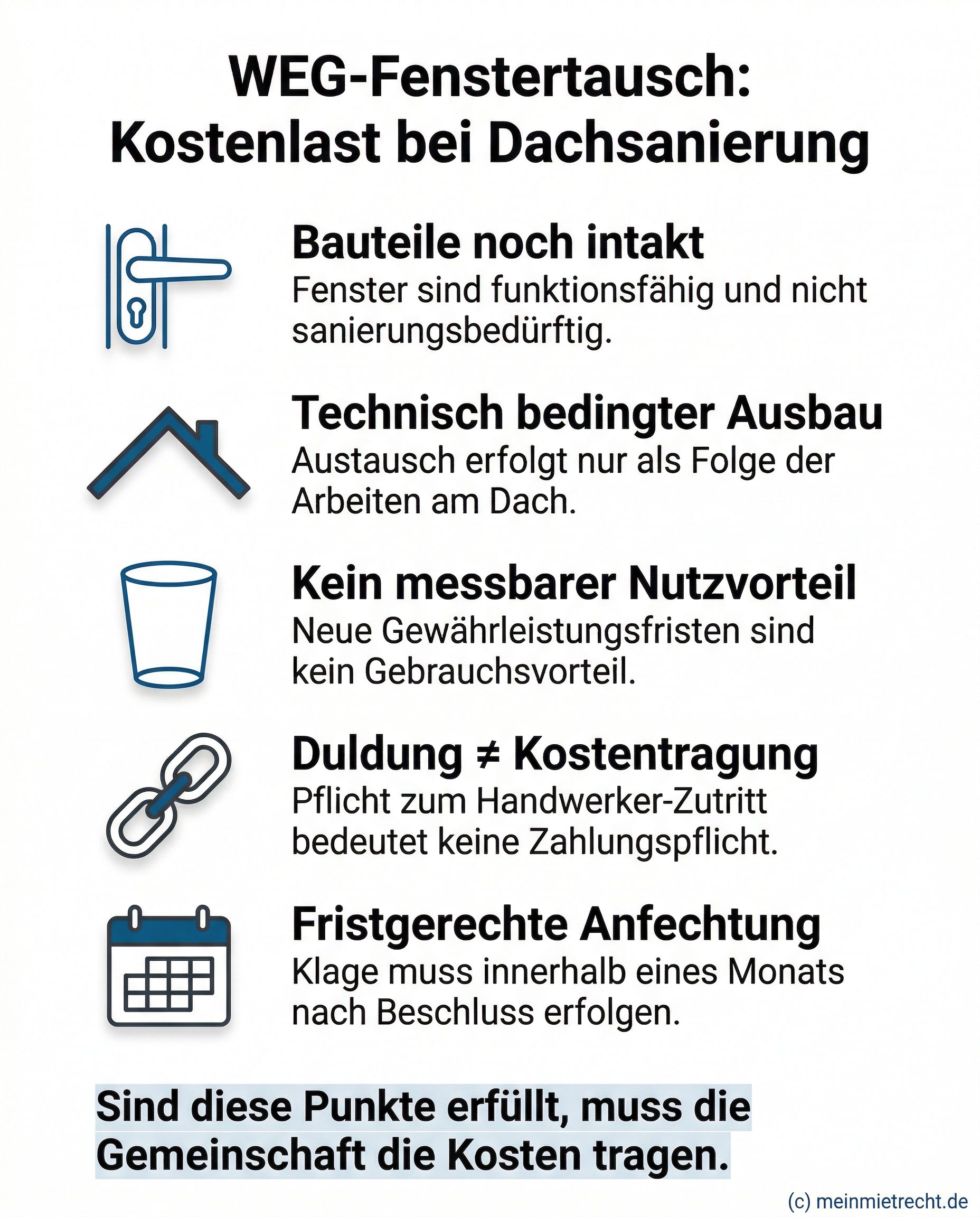 Der entscheidende Hebel dieses Urteils war der Zustand der Fenster zum Zeitpunkt des Ausbaus. Wenn Ihre Fenster (oder andere Bauteile) noch voll funktionsfähig sind und nur deshalb ersetzt werden, weil eine Sanierung am Gemeinschaftseigentum (hier das Dach) dies technisch erzwingt, liegt die Kostenlast in der Regel bei der Gemeinschaft. Eine Umlegung auf Sie als Sondereigentümer ist oft unzulässig, da Ihnen durch den vorzeitigen Austausch kein messbarer Sanierungsvorteil entsteht, sondern lediglich das allgemeine Baurisiko auf Sie abgewälzt wird.