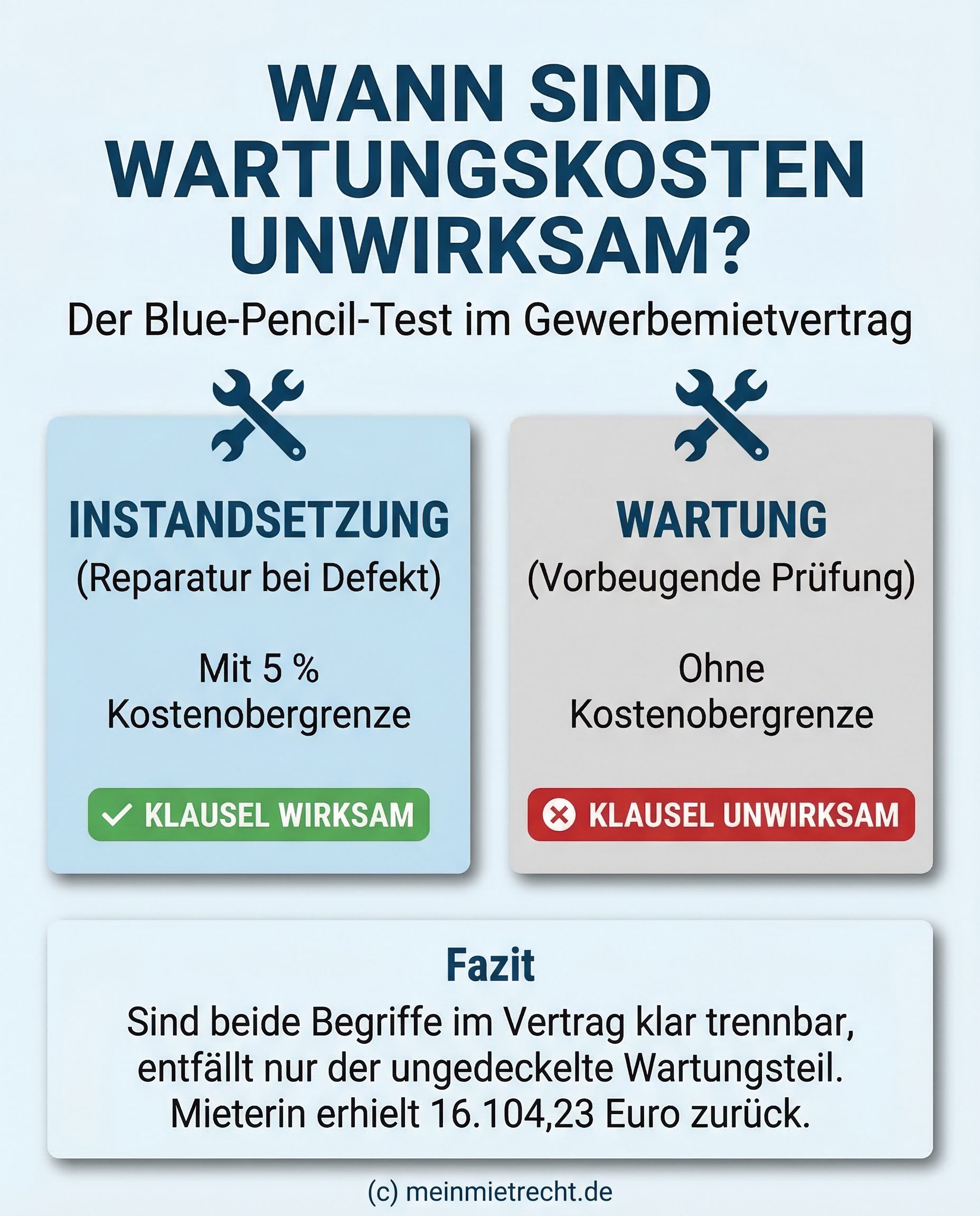 Nach dem sogenannten Blue-Pencil-Test können Vertragsklauseln auch lediglich teilweise unwirksam sein, sofern die unwirksamen Bestandteile ohne Sinnverlust aus dem Text gestrichen werden können. Eine solche inhaltliche Trennbarkeit ist regelmäßig dann gegeben, wenn Begriffe wie Wartung und Instandhaltung sprachlich nicht zwingend untrennbar miteinander verzahnt sind. Somit bleibt ein wirksam gedeckelter Teil einer Vertragsklausel, beispielsweise für Instandsetzungen, rechtlich bestehen, selbst wenn der ungedeckelte Wartungsteil ersatzlos entfällt.